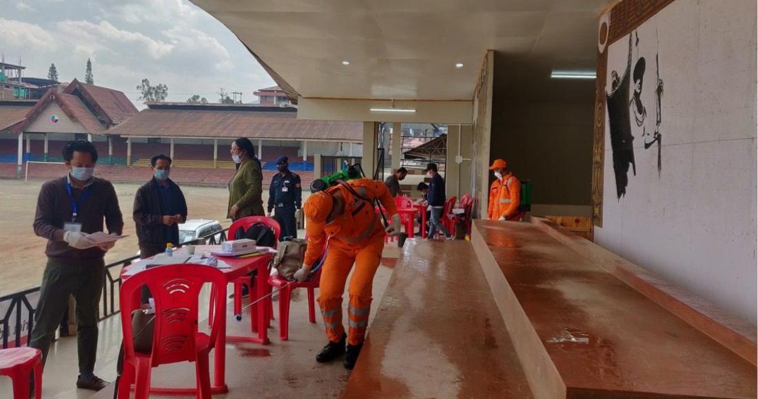 The 12th BN NDRF personnel from Doimukh Arunachal Pradesh currently stationed at Thizama spraying disinfectants at DC's Office, Kohima Relief Distribution Center Local ground and other strategic locations on 9th April 2020.