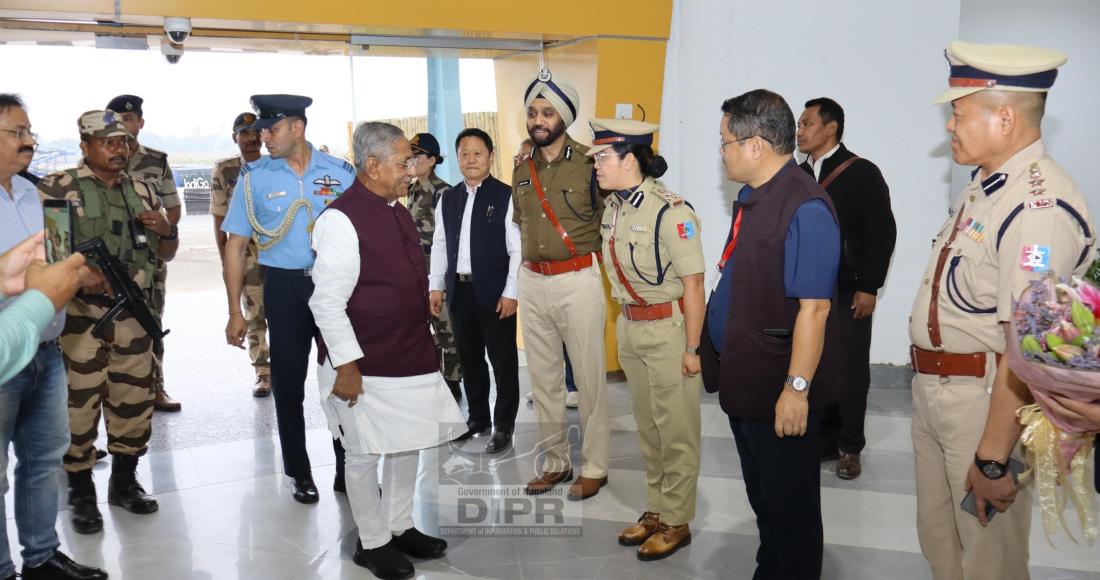 Governor-designate of Nagaland, Nand Kishore Yadav, being received by Commissioner, Nagaland, Gregory Thejawelie, IAS; IGP (Range), Jasbir Singh, IPS; Commissioner of Police, Dimapur, Aotula T. Imchen, IPS; DC Chumoukedima, Polan John, NCS; and DCP Chumoukedima, Nikho Venuh, NPS on his arrival at Dimapur Airport on 12th March 2026.