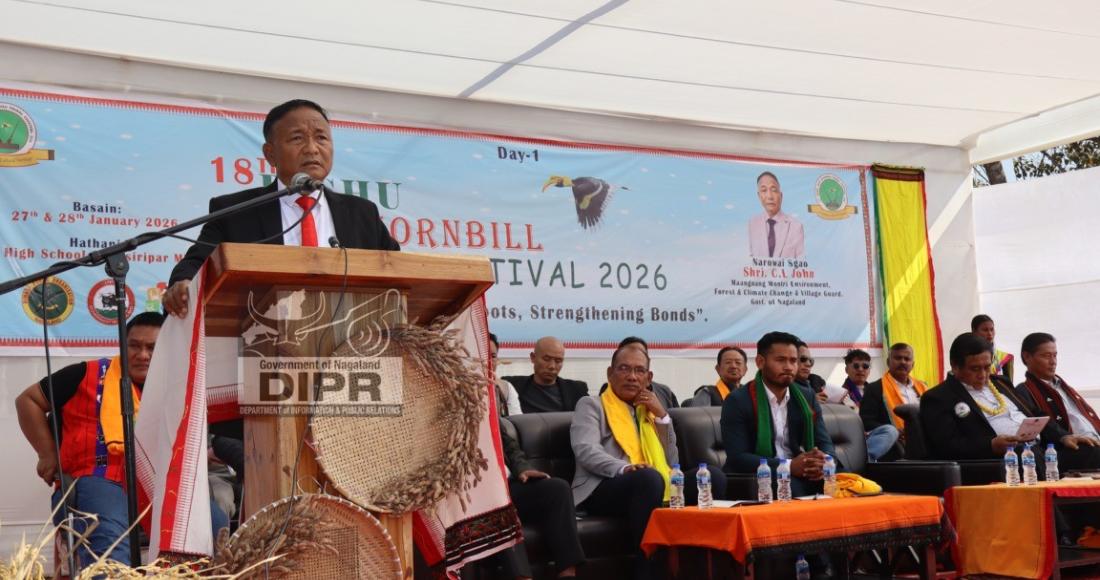 Minister, Environment, Forest & Climate Change and VG, C. L. John addressing during the Bishu Mini Hornbill Tribal Festival 2026 held at Dhansiripar, Chumoukedima on 27th January 2026.
