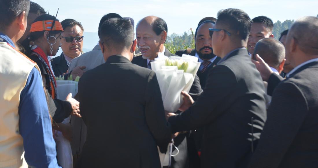 Chief Minister, Dr. Neiphiu Rio and Deputy CM, Y. Patton being felicitated on their arrival at the 1st Mon Edition of International Hornbill Festival at Wangkhao Helipad, Mon on 8th December 2025.