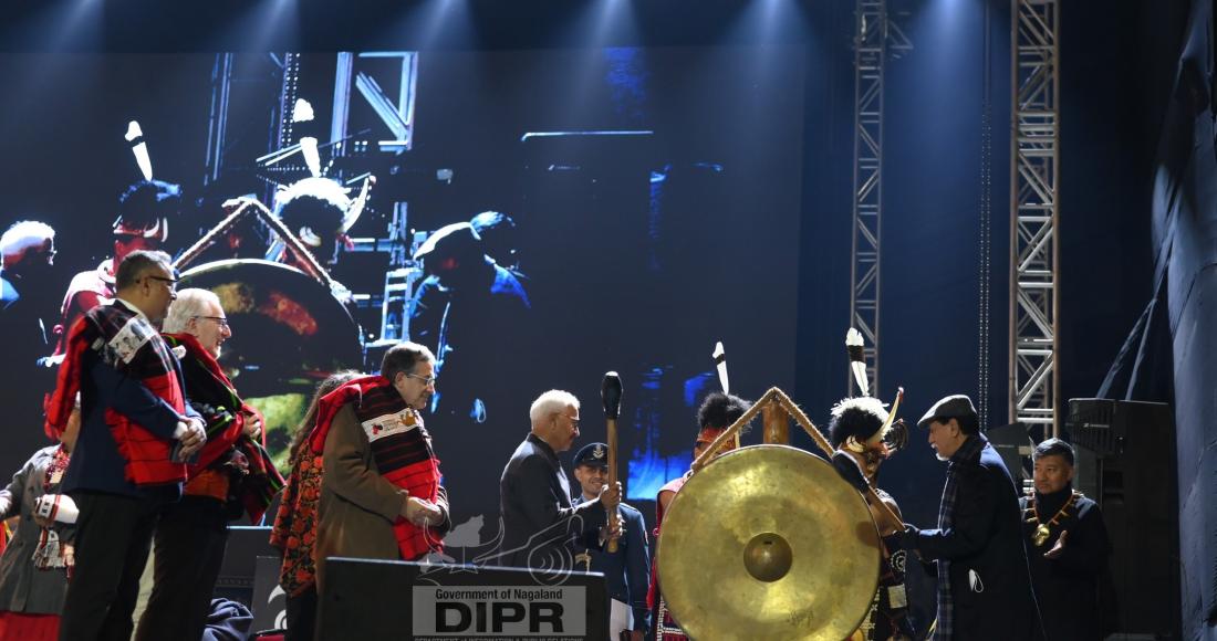 Governor of Nagaland & Manipur, Ajay Kumar Bhalla and Chief Minister, Nagaland, Dr. Neiphiu Rio, sounding the Gong at the inaugural programme of the 26th edition of the Hornbill Festival at Naga Heritage Village, Kisama, Kohima on 1st December 2025.