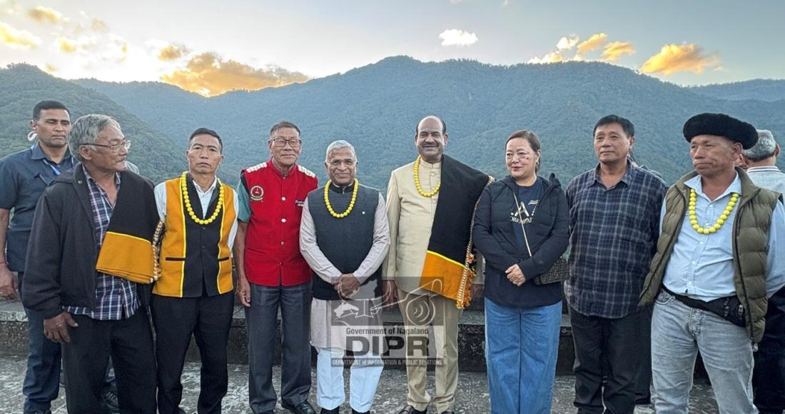 Lok Sabha Speaker, Om Birla, Dy. Chairman Rajya Sabha, Harivansh with Minister for Horticulture and Women Resource Development, Salhoutuonuo Kruse along with village elders, during their visit to Khonoma village, Kohima on 10th November 2025.