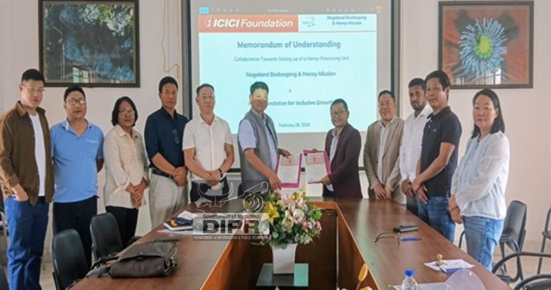 A Memorandum of Understanding (MoU) was signed between Nagaland Bee Keeping & Honey Mission, Nagaland and ICICI Foundation for supporting rural development and for inclusive growth on the 28th February 2026 at Nagaland Bee Keeping & Honey Mission, Chumoukedima. The MOU was signed by the officials under the presence of Sentiwapang Aier, Secretary to Chief Minister and Team Leader NBHM, and Pumgouthing Tunzalion-Zonal Head ICICI foundation, Remei Diphung - Development officer ICICI foundation and Rajkumar Bartha, Branch Manager, Purana Bazaar Branch