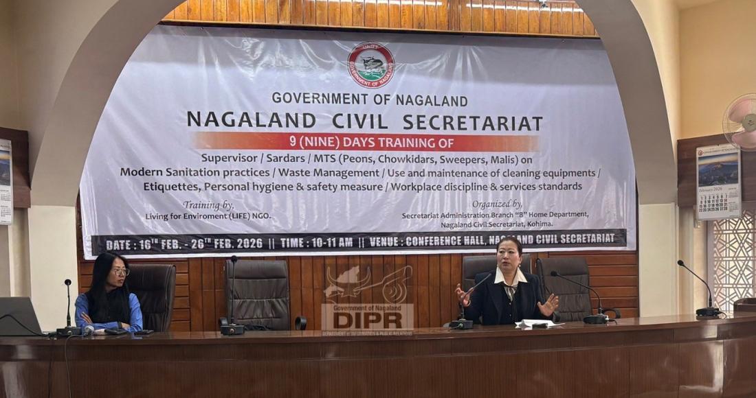 The resource person Niksungla, Founder-Chairman of Living for Environment (LiFE), imparted practical knowledge to the trainees on modern sanitation practices, effective waste management, proper use and maintenance of cleaning equipment, workplace etiquette, personal hygiene, safety measures, workplace discipline, and service standards. She informed that the initiative seeks to strengthen cleanliness standards and promote a disciplined and professional work culture within the Secretariat premises by equipping frontline staff with updated practices and service-oriented approaches.