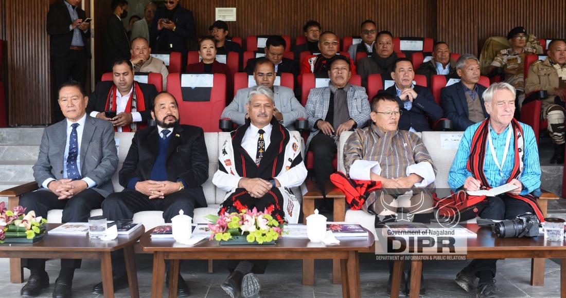 The third day of the 26th Edition of the Hornbill Festival 2025 witnessed a vibrant array of cultural presentations on 3rd December at the Naga Heritage Village, Kisama. The Cultural Show was hosted by Deputy Chief Minister and Minister-in-charge of Home and Border Affairs, Yanthungo Patton and co-hosted by Advisor for Food & Civil Supplies and Legal Metrology, K. Tokugha Sukhalu. Distinguished guests included the Ambassador of Bhutan, Consul General H.E. Jigme Thinlye Namgyal, Air Marshal Surat Singh, SM, Commanding-in-Chief, Eastern Air Command, Indian Air Force, Lt. Gen. Mohit Wadhwa, GOC 101 Area, Simon Lee Broughton, Founding Editor of Songlines, and other dignitaries.