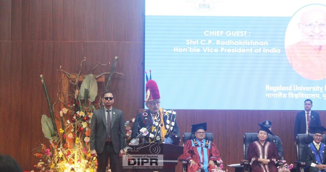 In his convocation address, Vice President C. P. Radhakrishnan conveyed his best wishes to the graduating students and expressed immense joy at visiting Nagaland for the first time. He praised the vibrant culture and courage of the people of Nagaland, describing the state’s culture as colourful and unique.