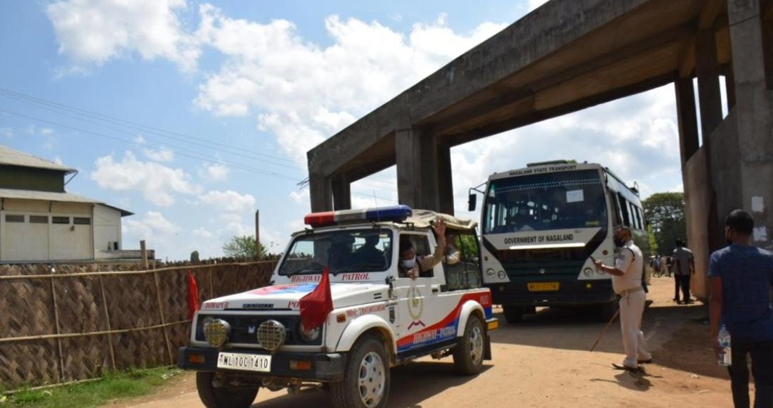 The first bus with stranded people leaving for Mon with police escort from State Badminton stadium Dimapur on 7th May 2020.