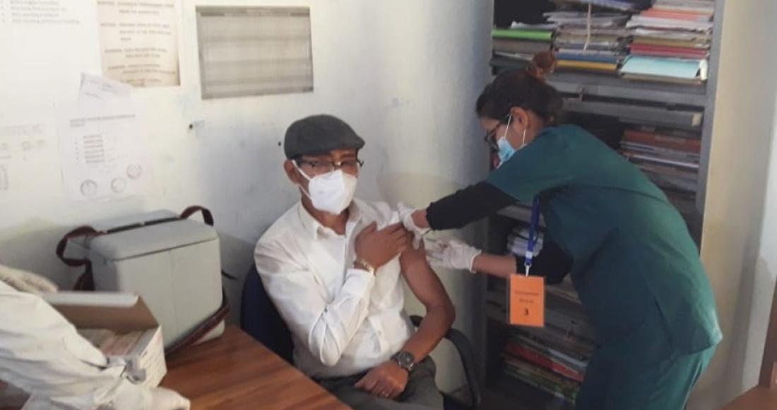 Dr.Yanpothung Kithan receiving the first vaccine jab during the COV1D-19 Vaccination drive at CHC Bhandari on 19th January 2021.