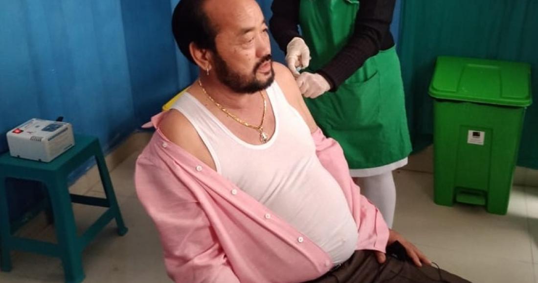 Deputy Chief Minister and Minister in-charge of Roads & Bridges, Y. Patton receiving the first dose of Covid 19 Vaccine Covishield at Naga Hospital Kohima on 3rd March 2021.