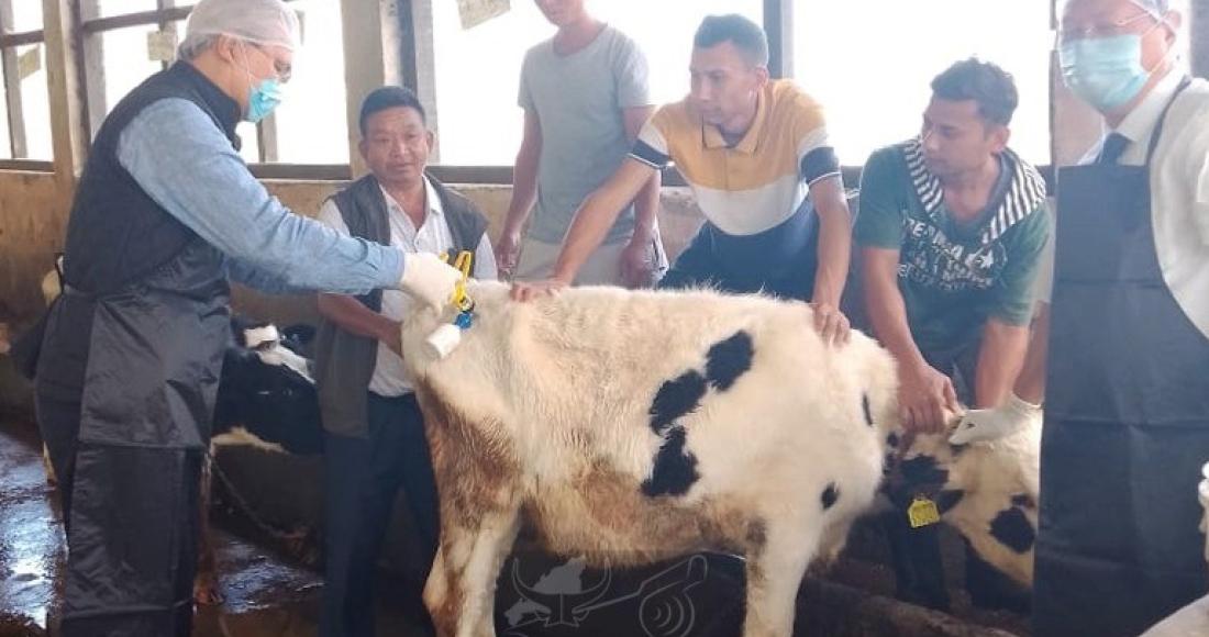 Director of AH & VS, Dr. BM Sunep administering the 1st FMD vaccine to mark the launch of the Phase VI of the FMD Vaccination Mission in the state at the State Cattle Breeding Farm, Lerie, Kohima on 15th October 2025. (DIPR)