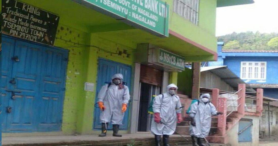 Frontline workers, fight against Covid-19 pandemic ready for routine fumigation of disinfectants at key places in Tseminyu Town, 21st April 2020.