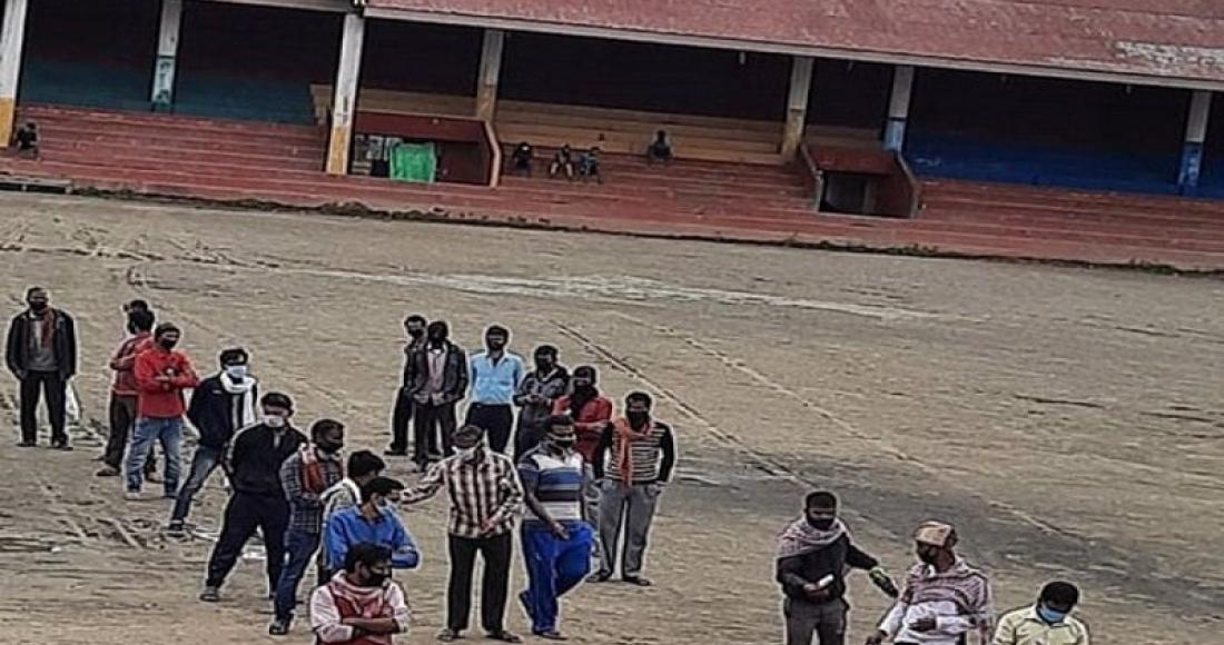 Kohima Newspaper hawkers receiving their relief ration for the second time at the Kohima Relief Distribution Centre, Local Ground Kohima on 29th April 2020.