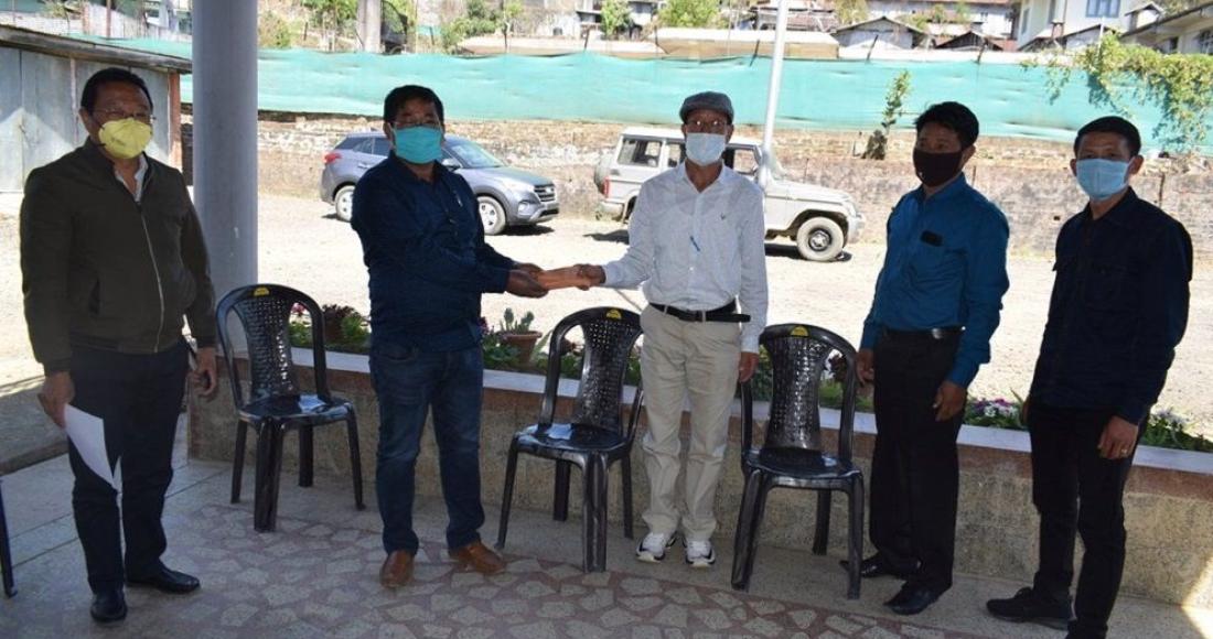 Executive Secretary, LBCA, Vankhosung Rev Nyanchumo Lotha handing over cash to DC Wokha, Orenthung Lotha to fight against the spread of COVID-19 on 30th March 2020. (IA Wokha)