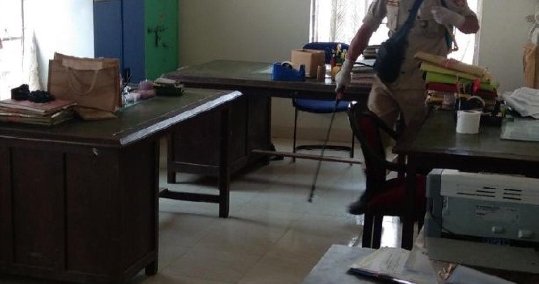 Under the initiative of Mokokchung District Task Force for COVID-19, MMC and Personnel of Home Guards spraying disinfectant at DPRO Office Mokokchung on 31st March 2020. (DPRO Mokokchung )