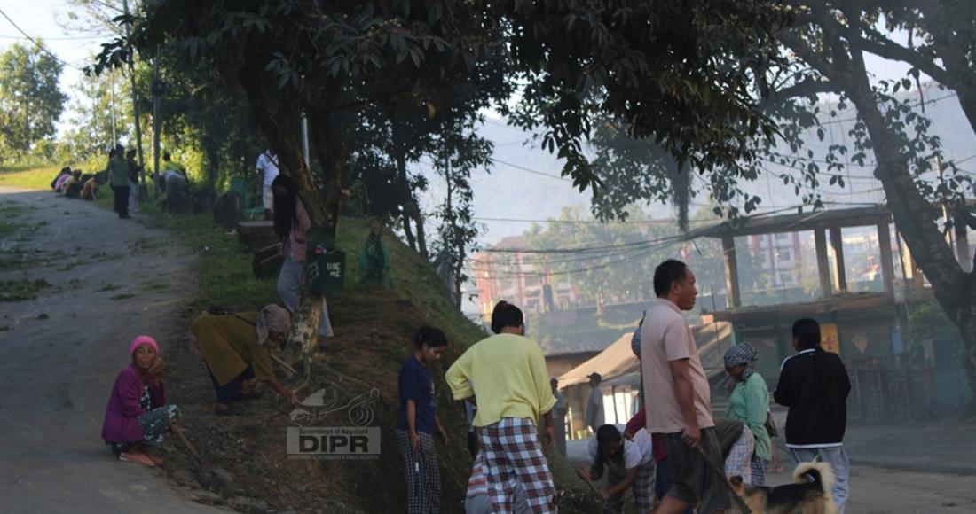 All the 11 (Eleven) wards, business establishments and the general public of Mon Town participated in the mass social work by engaging with cleaning and clearing of the drains, removal of sludge, cutting of overgrowth and bushes, and cleaning of the plastic waste littered by the roadside nallah.