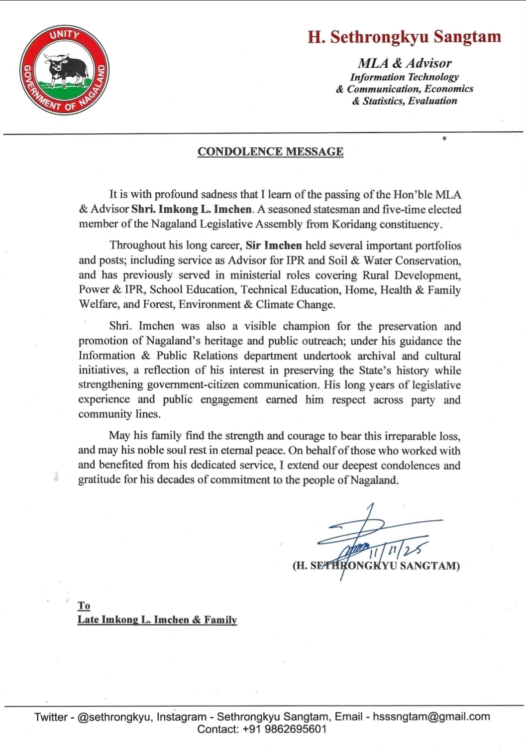 Photo News CONDOLENCES MESSAGES FOR LT. IMKONG L IMCHEN FROM ADVISOR, IT&C, ECONOMICS & STATISTICS AND EVALUATION, H. SETHRONGKYU Nov 11 2025