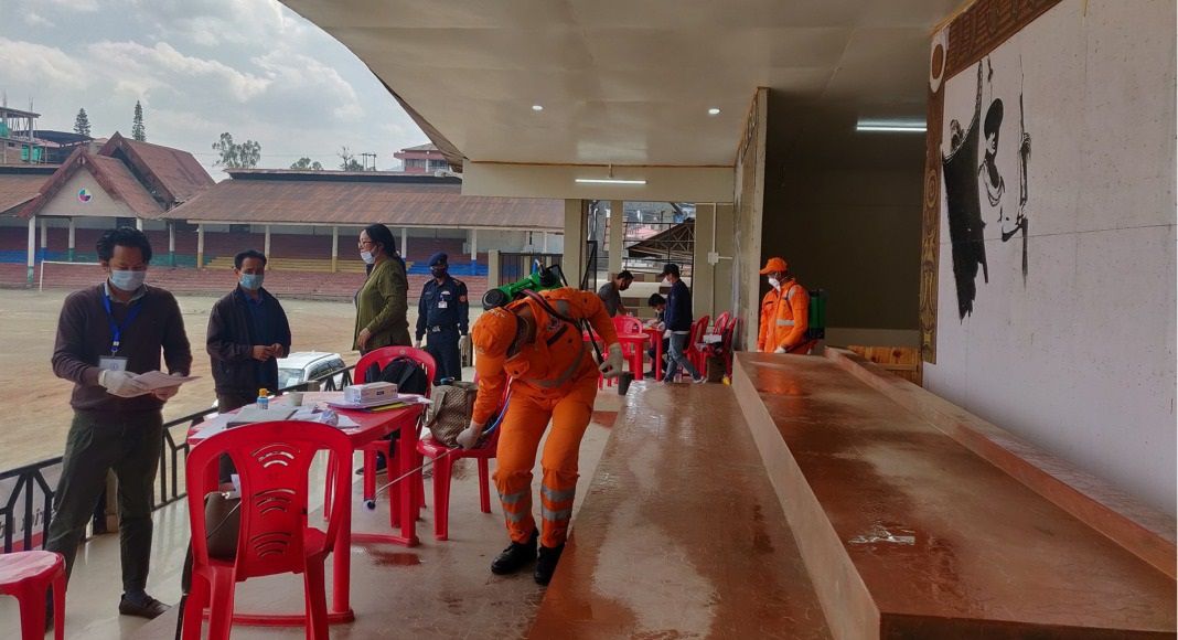 Photo News 12th BN NDRF personnel from Doimukh Arunachal Pradesh spraying disinfections at relief distribution centre Kohima Apr 09 2020
