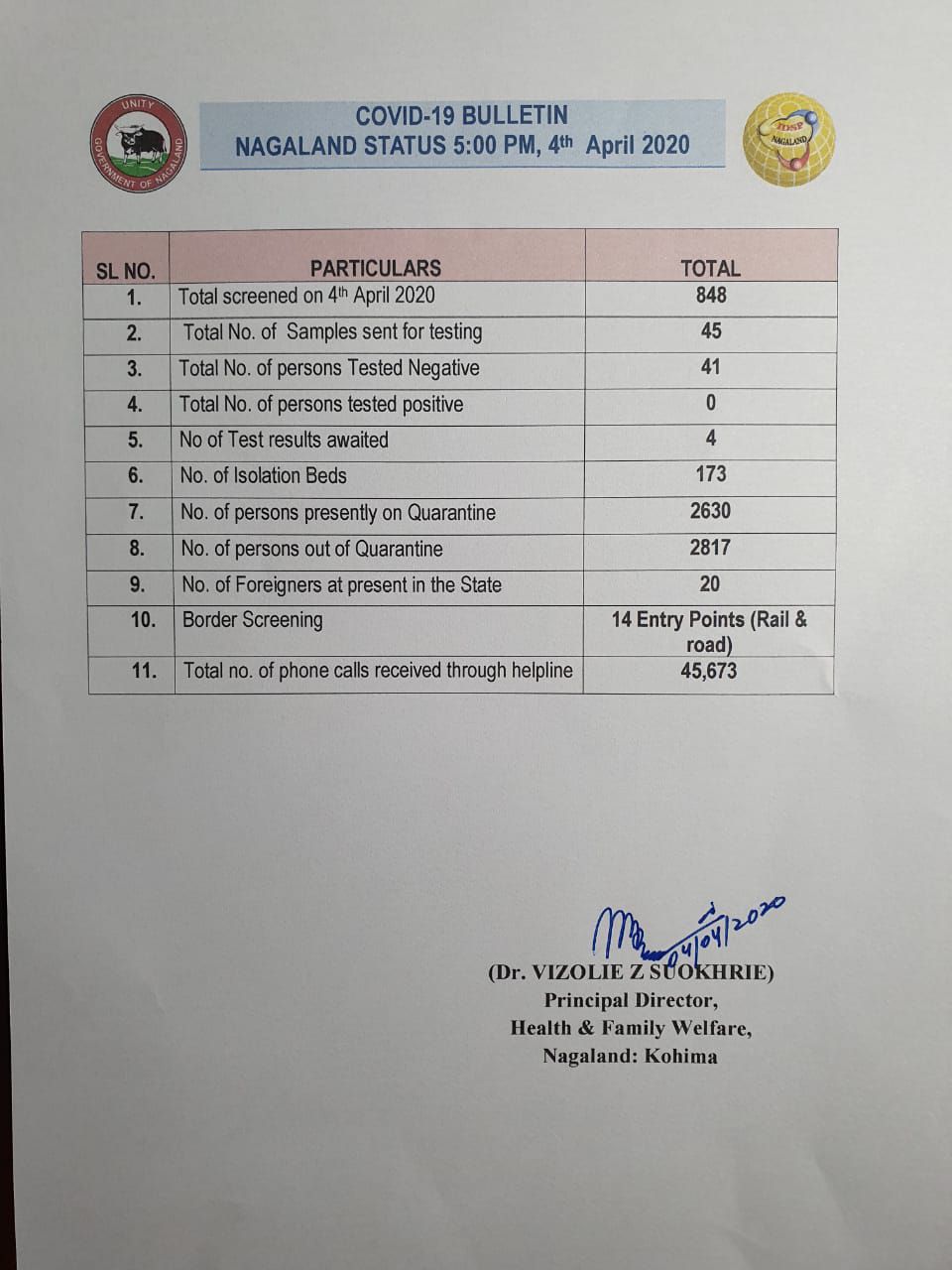 Statement on COVID -19 Status in Nagaland as on 04.04.2020