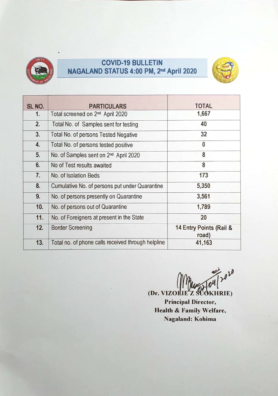 NEIBA KRONU BRIEFS ON THE STATUS OF COVID-19 FOR NAGALAND ON 2nd April 2020