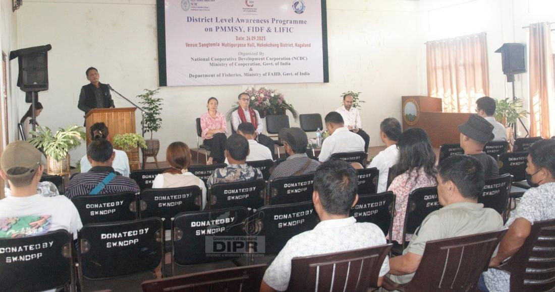 Joint RCS and MD, MARCOFED, Government of Nagaland, R. Bendang Ao speaking during the One-day District Awareness Programme on PMMSY/FIDF/LIFIC, organised by NCDC LINAC and RTC, Guwahati held at Sangtemla Multipurpose Hall, Mokokchung on 25th September 2025.(DPRO Mokokchung)