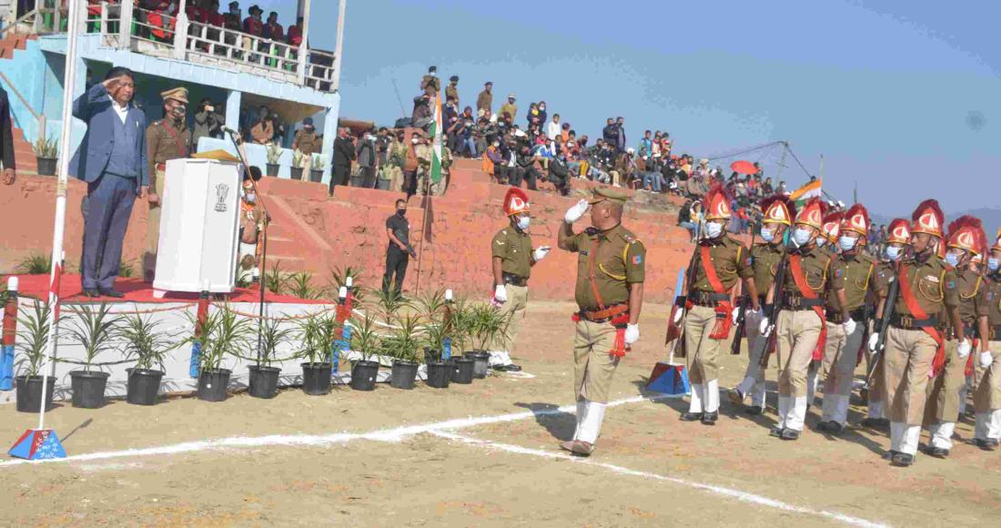 Minister for PHED, Jacob Zhimomi, taking Rashtriya Salute on the occasion of 72nd Republic Day celebration at Tuensang on 26th January 2021.