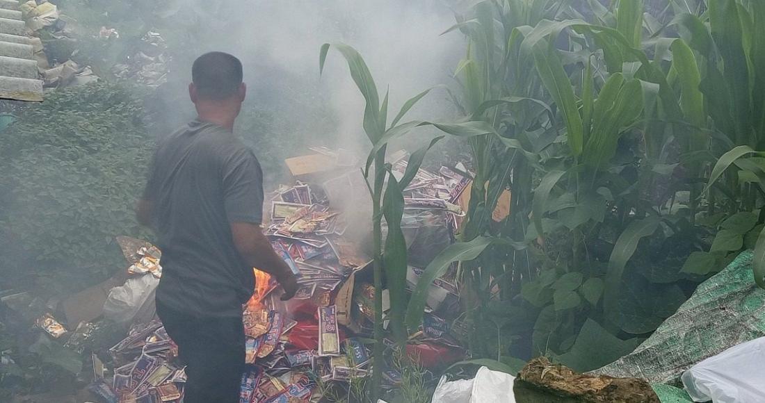 Seized Tobacco products being destroyed by the enforcement team of DTCC and North Police Personnels on 22nd June 2020 at North Police Station premises, Kohima.